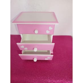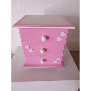 Lindos porta joias organizadores com 3 gavetinhas Ideal pra organizar pequenos objetos ( brincos -anéis- miçangas...) Pintadas externa e interna com tinta de qualidade e verniz **Cores : banco com rosa- Tamanho 17x12cm