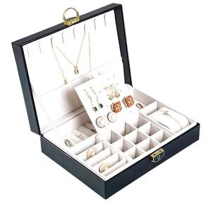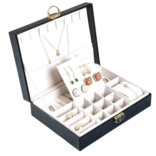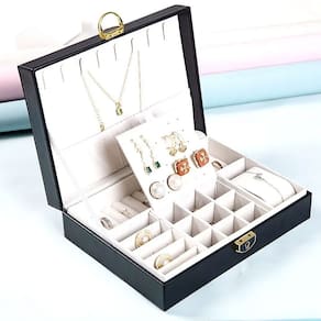 Armazenamento interno personalizável: múltiplos compartimentos separados com divisórias removíveis para acomodar joias de diferentes tamanhos e formatos.