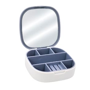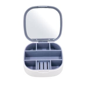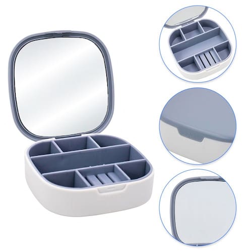 Mini Porta-Joias com Espelho Mini Porta Joia com Espelho Bijuteria Portátil Organizador Colar Anel Brinco Especificações: Dimensões: 10 x 10 x 3cm Composição: Plástico O Mini Porta-Joias com Espelho é um item prático e charmoso para guardar suas joias e acessórios de forma organizada e segura. Seu design compacto e elegante o torna perfeito para uso diário ou viagens. Confeccionado com materiais de qualidade, esse porta joias possui compartimentos internos com divisórias que permitem armazenar colares, pulseiras, anéis e brincos de maneira separada, evitando que se misturem e se danifiquem. Além disso, conta com um espelho na tampa, proporcionando a comodidade de se ver ao utilizar suas peças favoritas. A tampa do mini porta joias possui fecho seguro para garantir que seus itens estejam protegidos durante o transporte. O tamanho compacto permite que você o leve em sua bolsa ou mala facilmente, tornando-o um companheiro perfeito para qualquer ocasião. Seja para uso pessoal ou para presentear alguém especial, o Mini Porta Joias com Espelho é uma escolha encantadora e prática para guardar com carinho suas joias mais queridas. Especificações: Dimensões: 10 x 10 x 3cm de espessura. Composição: Plástico.
