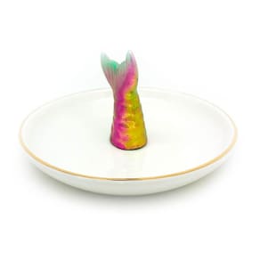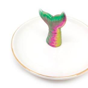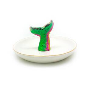Porta Jóias Holográfico - Sereia Super tendência, o Porta-Joias em Cerâmica Sereia era o que faltava para você colocar aéis, correntes, pingentes, brincos e pulseiras na cômoda, aparador, penteadeira ou no móvel. Vai enfeitar o quarto, o closet e é um lindo presente para meninas e mulheres. Fabricado em cerâmica branca com uma linda cauda de sereia holográfica e borda do prato dourada.