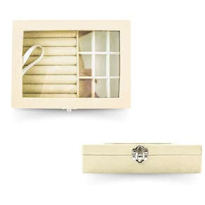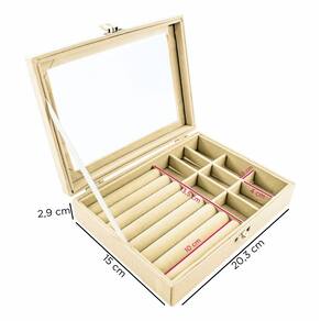 Contém: 01 - Porta Joias com divisórias removíveis, tampa acrílica e forro de veludo bege