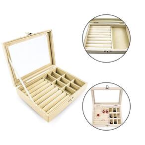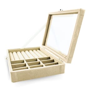 Contém: 01 - porta joias com divisórias removíveis, tampa acrílica e forro de veludo bege