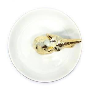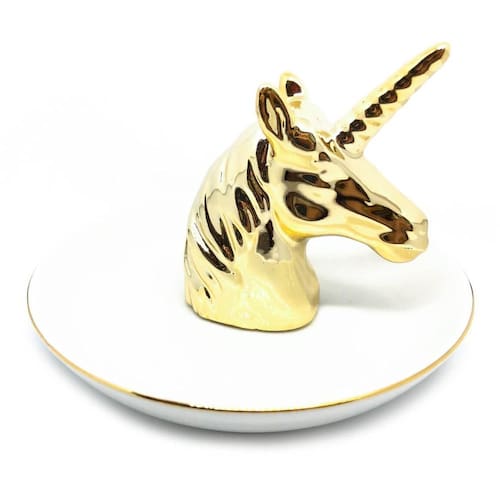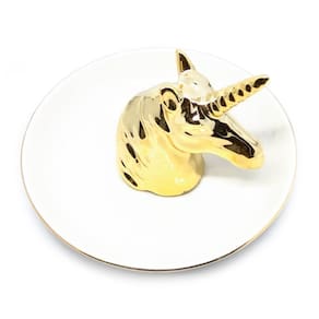 Porta Jóias - Unicórnio - Dourado Super tendência, o Porta-Joias em Cerâmica Unicórnio Dourado era o que faltava para colocar aneis, correntes, pingentes, brincos e pulseiras na cômoda, aparador, penteadeira ou no móvel. Vai enfeitar o quarto, o closet e é um lindo presente para meninas e mulheres. Fabricado em cerâmica branca com detalhes dourados.