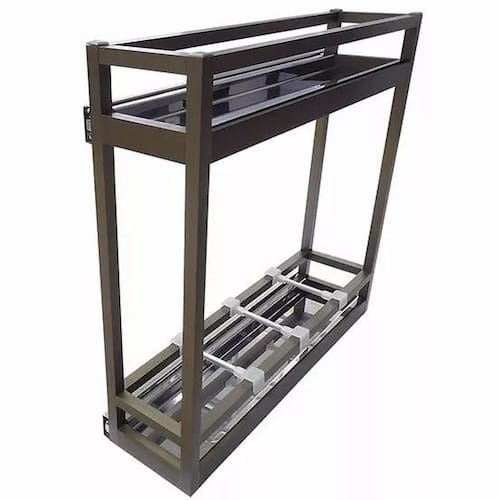 Porta latas/óleos Lateral bronze com trilhos 130x450x450mm Produto confeccionado em alumínio anodizado, acompanha trilhos telescópicos zincados, que vão montados na peça.Tem a variação de trilhos telescópicos com amortecedor.Seus fundos, para o apoio das latas e condimentos, agora são feitos por bandejas em inox 430, até mesmo no modelo anodizado fosco. Os trilhos não entram na garantia dos produtos. Código: 9303 - bronze - trilhos normais sem amortecedor Medidas totais: 130x450x450mm