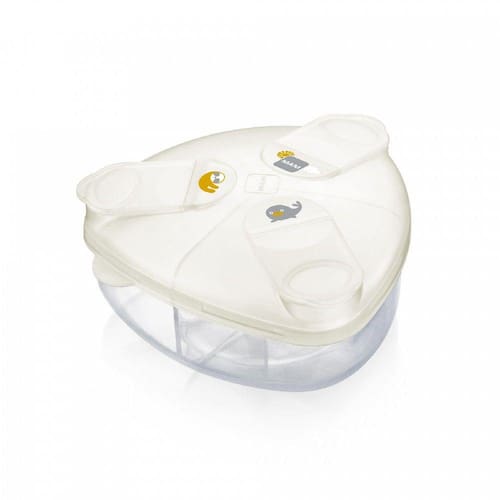 O Porta Leite em Pó da MAM é especialmente leve e pode conter até três doses. Graças à sua forma triangular o conteúdo pode ser transferido facilmente para a mamadeira sem deixar quaisquer sobras.