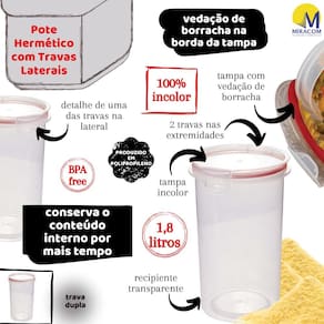 Pote plástico com capacidade para 1,8 litros. Possui silicone na tampa e travas laterais para uma melhor vedação e conservação do alimento. Produzido em material atóxico e livre de BPA. Pode ser levado ao freezer e ao micro-ondas.