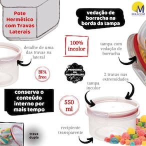 Pote plástico com capacidade para 560 ml. Possui silicone na tampa e travas laterais para uma melhor vedação e conservação do alimento. Produzido em material atóxico e livre de BPA. Pode ser levado ao freezer e ao micro-ondas. Diferenciais: - Modular e Empilhável: otimiza espaço em seu armário. - Tampa transparente: ótima organização em gavetas. - Vedação com borracha: vida longa aos alimentos. - Travas de fechamento: segurança ao fechar e abrir. - Livre de bisfenol-A (BPA FREE). Material: polipropileno e tampa com silicone Capacidade: 0,56 litros Comprimento: 13,6 cm / Largura: 13,1 cm / Altura: 7,4 cm Marca: Não Informado