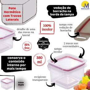 Pote plástico com capacidade para 380 ml. Possui silicone na tampa e travas laterais para uma melhor vedação e conservação do alimento. Produzido em material atóxico e livre de BPA. Pode ser levado ao freezer e ao micro-ondas. Diferenciais: - Modular e Empilhável: otimiza espaço em seu armário. - Tampa transparente: ótima organização em gavetas. - Vedação com borracha: vida longa aos alimentos. - Travas de fechamento: segurança ao fechar e abrir. - Livre de bisfenol-A (BPA FREE). Material: polipropileno e tampa com silicone Capacidade: 0,38 litros Comprimento: 11,0 cm / Largura: 10,4 cm / Altura: 7,6 cm Marca: Não Informado