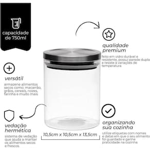 Práticos e bonitos, de qualidade Premium o Porta Mantimentos Mimo Style irá te ajudar a organizar a sua cozinha com praticidade e um toque de charme, úteis para armazenar alimentos secos - macarrão, grãos, cereais, feijão, lanches, café, chá, nozes, farinha, açúcar e muito mais. Feito em vidro durável possui parede dupla e resistente a variação de temperaturas, com vedação hermética favorece para que o alimento armazenado fique sempre seco e fresquinho, ideal para o consumo. ;