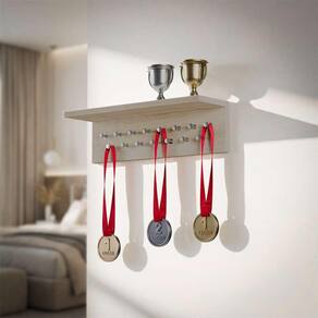 Produzido em MDP de 15 mm, o nicho oferece resistência e durabilidade para o uso diário. Possui pinos metálicos para pendurar medalhas com segurança e uma prateleira superior, ideal para acomodar troféus, miniaturas ou itens decorativos.