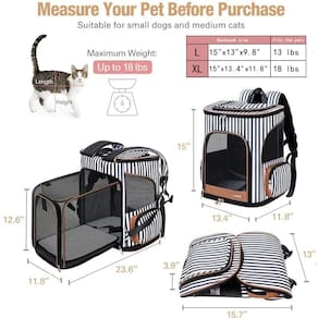 Mochila expansível Lekereise para cães e gatos pequenos e médios Características: Vários designs de janelas de malha oferecem boa ventilação. A mochila expansível para gatos dá ao seu animal de estimação mais espaço para se movimentar. Painel traseiro acolchoado, alças ergonômicas e alça peitoral ajustável, tornando a mochila para cães uma boa mochila de viagem para gatos. 3 aberturas para o animal de estimação entrar facilmente. Bolsos laterais podem armazenar itens pequenos. Os tapetes macios incluídos são removíveis e podem ser lavados à mão. Observação: Meça o tamanho e o peso do seu animal de estimação antes de comprar. - ?Tamanho maior ajustado?- Tamanho expandido: 60 x 34 x 38 cm, tamanho não expandido: 13,4 x 11,6 x 38 cm. Serve para animais de estimação com menos de 8 kg, como a maioria dos gatos, cães pequenos e coelhos. - ?Dobrável e expansível?- A mochila para animais de estimação tem uma parte traseira expansível que dá ao seu animal de estimação mais espaço para se movimentar e reduz a ansiedade. O design dobrável ajuda você a economizar espaço quando não estiver em uso. - ?Respirável e visível?- Há malha respirável resistente a rasgos de 4 a 7 (quando expansível ou não expansível) na frente, na parte superior e nas laterais da mochila para gatos, o que torna a mochila para gatos mais ventilada e conveniente para você ver seu animal de estimação dentro. A parte superior da mochila para cães pode ser aberta para permitir que seu gato/cão coloque a cabeça para fora. - ?Adequado para viagem?- Mochila portátil para animais de estimação com painel traseiro respirável, alças acolchoadas ajustáveis e fivela no peito para viagens, caminhadas, caminhadas e atividades ao ar livre, a verdadeira mochila de transporte de viagem para gatos. - ?Premium e funcional?- Feita de poliéster de qualidade e malha anti-arranhões, esta mochila expansível para gatos é resistente e segura para seus animais de estimação. 2 bolsos laterais para guardar suprimentos para animais de estimação e uma coleira de segurança embutida para evitar que seu animal de estimação fuja.