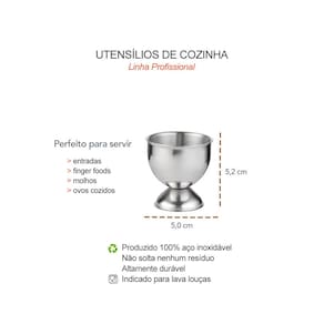 Mini taça é perfeita para servir entradas, aperitivos, ovos cozidos e quentes, evitando que escorregue ou queime as mãos. O porta ovo possui uma base para manter estabilidade ao objeto, proporcionando mais segurança em seu manuseio. O suporte em aço inox, garante a durabilidade da peça, pois nao enferruja e mantem o brilho por muito mais tempo.
