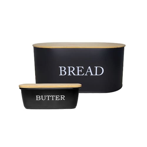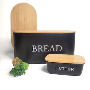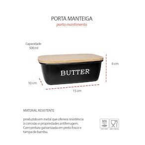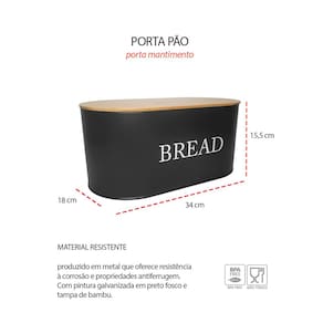Porta pao preto e manteigueira com tampa de bambu. Pote produzido em aço carbono e tampa de bambu. O porta mantimentos possui pintura galvanizada interna e externa na mesma cor. O porta pao possui acabamento resistente a corrosao e propriedades antiferrugem.