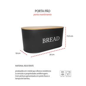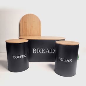 Contem: 1 Porta Pao Medidas: 34 x 18 x 15,5 cm 1 Pote de Cafe 1 Pote de Açucar Volume: 1400 ml Medidas: 15,5 x 11,5 cm Material: aço carbono e bambu