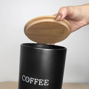 Porta pao, pote de cafe e açucar com tampa de bambu. Pote produzido em aço carbono e tampa de bambu. O porta mantimentos possui pintura galvanizada interna e externa na mesma cor. Potes hermeticos que possuem tampa de bambu com anel de silicone, acabamento resistente a corrosao e propriedades antiferrugem.