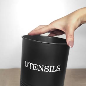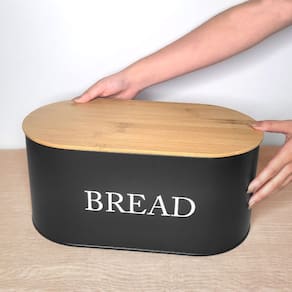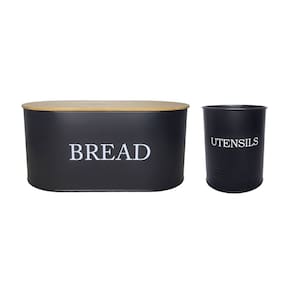Porta pao preto com tampa e porta utensilios. Pote produzido em aço carbono e tampa de bambu. O porta mantimentos possui pintura galvanizada interna e externa na mesma cor. O porta pao possui acabamento resistente a corrosao e propriedades antiferrugem.