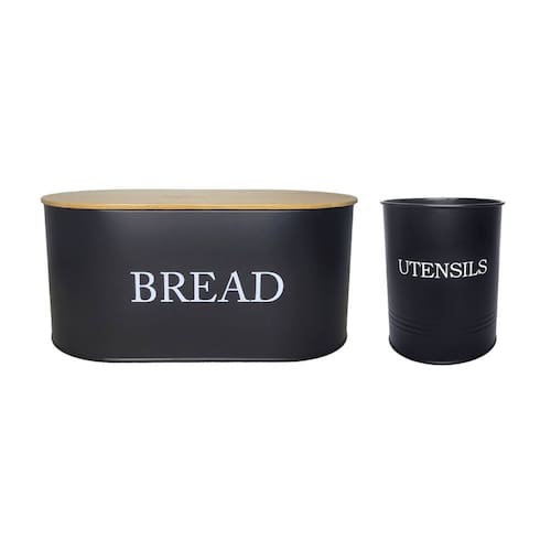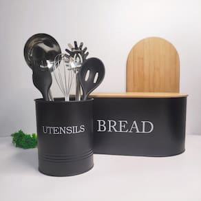 Contem: 1 Porta Pao Medidas: 34 x 18 x 15,5 cm 1 Porta Utensilios Medidas: 15,5 x 12,5 cm Material: aço carbono e bambu