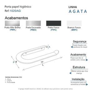 O cabide da linha Agata possui um design minimalista em linhas arredondadas, é uma peça de requinte que se destaca com luxo no seu banheiro. Além de decorar, organiza com funcionalidade o banheiro. Criado em metal nobre aço inox com uma qualidade que abrange áreas litorâneas e possui a de um acabamento muito resistente. Agora é só você adquirir este lindo acessório e fazer o seu projeto se tornar realidade com um banheiro prático para toda a sua família. Características Fabricado em metal aço inox. Disponível no Prata Alto Brilho, Escovado e Preto Fosco. Pode ser instalado em parede, azulejo e porcelanato. Benefícios Fixação prática e segura com parafusos e buchas inclusos. O produto não possui nenhum detalhe em plástico ABS . Fácil higienização, ideal para locais que exigem limpeza constante. Aproveitamento inteligente do espaço, ideal para ambientes compactos. Resistente à corrosão e luz solar. Itens ENVIADOS: 1 cabide, kit de parafusos e manual instrução instalação. Instalação INTELIGENTE Ao 1º furo, use uma broca medida menor, após use a medida correta e finalize, vai ajudar na precisão da fixação da bucha principalmente em azulejos e porcelanato.