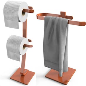 Este kit exclusivo em Rose Gold é composto por duas peças separadas: um Porta Papel Higiênico de Chão com capacidade para 2 rolos e um Porta Toalha de Bancada para Lavabo, ambos com acabamento refinado que combina beleza, modernidade e praticidade.