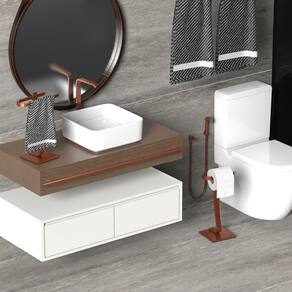 Este elegante kit em Rose Gold é composto por duas peças separadas: um Porta Papel Higiênico de Chão para 1 rolo e um Porta Toalha de Bancada para Lavabo, ideal para quem valoriza praticidade com um toque moderno na decoração.