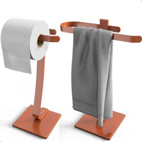 BENEFÍCIOS Kit com 2 peças independentes: liberdade para organizar conforme o espaço disponível. Porta papel com design compacto: ideal para ambientes menores ou minimalistas. Porta-toalha de bancada: funcional, decorativo e pronto para uso. Acabamento Rose Gold metálico: destaca o ambiente com requinte e modernidade. Alta resistência: pintura epóxi protege contra ferrugem e desgaste. Fácil limpeza: superfícies lisas e resistentes à umidade.