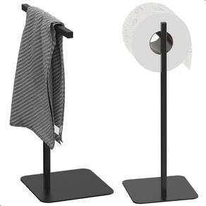Este conjunto é feito de aço inox e aço carbono, com acabamento em pintura eletrostática epóxi na cor preto fosco. As medidas do porta papel higiênico de chão são: altura de 35cm, largura x profundidade da base de 13cm x 13cm, e haste para rolo de 15cm. As medidas do porta toalha lavabo de bancada são: altura de 30cm, largura x profundidade da base de 13cm x 13cm, e haste de 22cm.