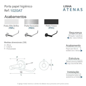 O porta papel da linha Atenas possui um design retrô, é uma peça que se destaca com luxo e elegãncia. Além de decorar, organiza com funcionalidade o banheiro. Criado em metais nobres com uma qualidade que abrange áreas litorâneas e possui a de um acabamento muito resistente. Agora é só você adquirir este lindo acessório e fazer o seu projeto se tornar realidade com um banheiro prático para toda a sua família. Características Fabricado em metal aço inox e alumínio. Disponível no Prata Alto Brilho, Escovado e Preto Fosco. Pode ser instalado em parede, azulejo e porcelanato. Benefícios Fixação prática e segura com parafusos e buchas inclusos. O produto não possui nenhum detalhe em plástico ABS . Fácil higienização, ideal para locais que exigem limpeza constante. Aproveitamento inteligente do espaço, ideal para ambientes compactos. Resistente à corrosão e luz solar. Itens ENVIADOS: 1 porta papel higiênico, kit de parafusos e manual instrução instalação. Instalação INTELIGENTE Ao 1º furo, use uma broca medida menor, após use a medida correta e finalize, vai ajudar na precisão da fixação da bucha principalmente em azulejos e porcelanato. Marca: Não Informado