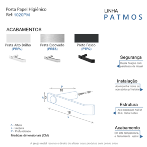 • Fabricado em metal aço inox. • Disponível no Prata Alto Brilho, Escovado e Preto Fosco. • Pode ser instalado em parede, azulejo e porcelanato.