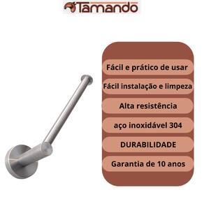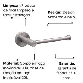 Informações técnicas: Materiais: corpo em aço inoxidável 304, base de fixação em aço inoxidável 201 e fixadores em aço carbono galvanizado e plástico de engenharia; Garantia de 10 anos; Conteúdo da embalagem: 1 porta papel higiênico e 1 kit de fixação.