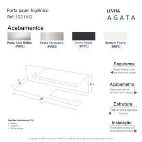 • Fabricado em metal aço inox. • Disponível no Prata Alto Brilho, Escovado e Preto Fosco. • Pode ser instalado em parede, azulejo e porcelanato.