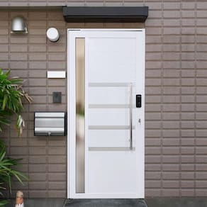 Porta Pivotante de Alumínio Branco Com Puxador, Friso e Vidro com Fechadura Digital Linha 30 - Bergame