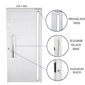 Aplicado em local: interno ou externo Vidro: Liso Ambientes Recomendados: Externo;Interno Acabamento do Puxador: Inox Acompanha Batedor: Não Acompanha Batente: Sim Acompanha Fechadura: Sim Acompanha Guarnição: Não Acompanha Manual de Instalação: Sim Acompanha Puxador: 02 Acompanha Trinco: Não Altura: 210 cm codigo_ean: 7898683666483 Cor: Branco Cor do Batente: Branco Cor do Produto: Branco Cor Predominante: Branco Dimensão da Máquina da Fechadura: 25.0000 Escala de Brilho: Semi-Brilho Espessura: 4,5 cm Espessura do Vidro: 6 mm Isolamento Acústico: Não Itens Inclusos: 1 Porta Lado de abertura: Direita Largura: 100 cm Largura do Batente: 4,5 cm Linha ou Coleção: Linha 25 Manual de Montagem e Instalação: https://product-hub-prd.madeiramadeira.com.br/862694/documents/ecbab5d8-3e4b-4006-bc14-32a83ea230a1uCOesdeinstalaCAopivotante.pdf Material do Batente: Alumínio Material do Puxador: Aço Material Principal: Alumínio Necessita Montagem: Não Número de Folhas: 01 Origem do Produto: Nacional Peso: 16 kg Possui Grade: Não Tamanho: 210 x 100 cm Textura da Porta: Com detalhe vidro Tipo de Parede: Alvenaria Tipo de Puxador: Externo Tipo de Vidro: Liso Vidro incluso: Sim Marca: Esquadrias Bergamo Ean: 7898683666483