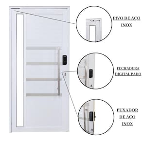 O produto acompanha batente, Friso, Vidro e Fechadura Digital, com 5 cartões de acesso e puxador.