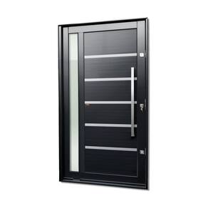 Portas Pivotante de Alumínio, Linha Elite, Pintura Eletrostática Preta, 1 Folha de Abrir para o Lado Direito, Vidro Liso Incolor 5mm Temperado, Lambris Horizontais e 5 Frisos Escovados, Puxador Milão 100 Cm Escovado, Altura 216 Cm, Largura 150 Cm, Requadro 11,5 Cm, Garantia de 5 anos contra defeitos de fabricação.