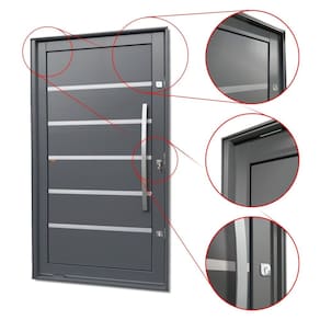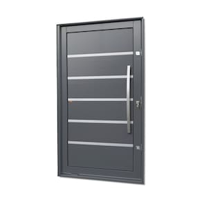 Portas Pivotante de Alumínio, Linha Elite, Pintura Eletrostática Cinza, 1 Folha de Abrir para o Lado Direito, Lambris Horizontais, 5 Frisos Escovados, Puxador Dubai 100 Cm Escovado, Altura 216 Cm, Largura 120 Cm, Requadro 11,5 Cm, Garantia de 5 anos contra defeitos de fabricação.