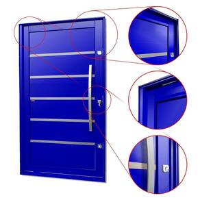 Portas Pivotante de Alumínio, Linha Elite, Pintura Eletrostática Azul, 1 Folha de Abrir para o Lado Direito, Lambris Horizontais, 5 Frisos Escovados, Puxador Dubai 100 Cm Escovado, Altura 240 Cm, Largura 150 Cm, Requadro 11,5 Cm, Garantia de 5 anos contra defeitos de fabricação.