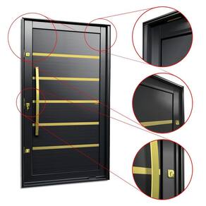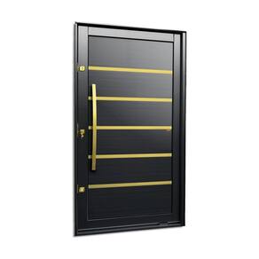 Portas Pivotante de Alumínio, Linha Elite, Pintura Eletrostática Preta, 1 Folha de Abrir para o Lado Esquerdo, Lambris Horizontais, 5 Frisos Escovados, Dourados e Envernizados, Puxador Dubai 100 Cm Escovado Dourado, Altura 240 Cm, Largura 150 Cm, Requadro 11,5 Cm, Garantia de 5 anos contra defeitos de fabricação.