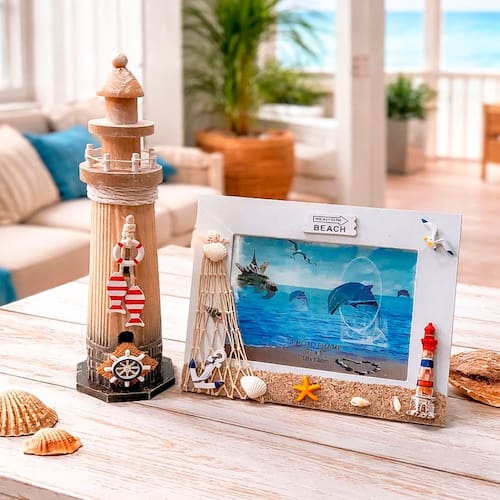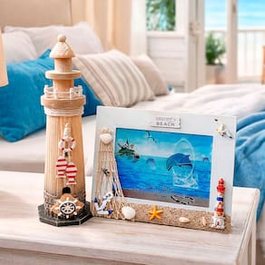 Leve o charme do mar para dentro da sua casa com o Kit Porta Retrato Farol Náutico! Ideal para quem ama decoração praiana, estilo navy e ambientes com clima de verão o ano todo