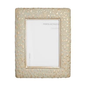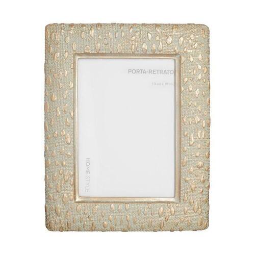 O Porta retrato Emma tem dimensões de 13 x 18 cm produzido em rezina com padronagem semelhante à animal print e detalhes dourados.