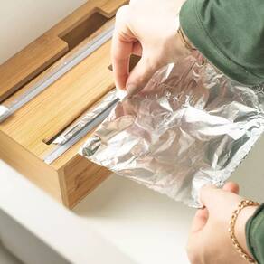 Feito 100% de bambu ecológico, promove sustentabilidade e traz sofisticação para o seu lar e sua cozinha. Seu design inovador, possibilita que seja utilizado tanto dentro de gavetas, quanto pendurado em paredes. O suporte possui aberturas laterais para facilitar a troca dos rolos e lâminas protegidas por canaletas para manusear e cortar com segurança.