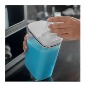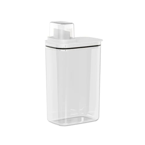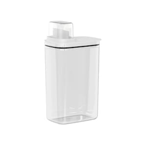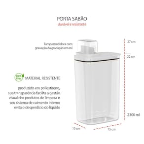 Porta sabao com dispenser de 2,3 litros. O porta sabao é perfeito para armazenar uma variedade de produtos de limpeza, como amaciante, sabao em pó e desinfetante. Sua transparencia facilita a gestao visual da lavanderia, proporcionando tranquilidade durante as tarefas domesticas. Tampa medidora possui gravaçao da gradaçao em ml, anel de vedaçao que mantem o recipiente fechado para maior segurança no manuseio e o sistema de caimento interno evita o desperdicio do liquido. Contem: 1 Porta Sabao Capacidade: 2,3 litros Medidas: 27 x 15 x 10 cm Material: Poliestireno (PS) Peso: 312 gramas
