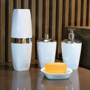 Jogo de banheiro em branco sólido e detalhe em pintura metalizada. Acessorios de banheiro de qualidade, produzido com material 100% reciclável, atóxico e livres de Bisfenol A (BPA Free).