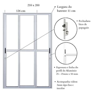 Você irá encontrar esta porta de correr de alumínio em 2 medidas: 210cm de altura, com as larguras de 120, 150, 180 e 200 cm.
