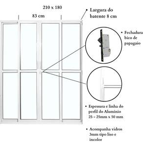 Dica de instalação: Ao adquirir uma porta de correr é importante notar que sua instalação deve respeitar o nivelamento, verifique o alinhamento das extremidades com uma ferramenta de nível para garantir a qualidade da instalação. Ambientes Recomendados: Externo, Interno Acompanha Batedor: Não Acompanha Batente: Sim Acompanha Dobradiça: Não Acompanha Fechadura: Sim Acompanha Guarnição: Não Acompanha Manual de Instalação: Sim Acompanha Puxador: Não Acompanha Trinco: Não Altura: 210 cm Ambiente Principal: Quarto Cor: Preto Cor do Batente: Preto Cor do Produto: Preto Cor do Produto: Preto Cor do Vidro: Incolor Elétrica: Não Escala de Brilho: Semi-Brilho Espessura: 8 cm Espessura do Vidro: 3 mm Isolamento Acústico: Não Itens Inclusos: 01 porta Lado de abertura: Central Largura: 180 cm Largura do Batente: 8 cm Linha ou Coleção: Linha 25 Manual de Montagem e Instalação: https://product-hub-prd.madeiramadeira.com.br/932727/documents/86bedcd7-06c4-4027-8dbe-02ac93456c022240372510317241555998978.pdf Material do Batente: Alumínio Necessita Montagem: Não Número de Folhas: 04 Origem do Produto: Nacional Peso: 69 kg Possui Grade: Não Recomendações de Uso, Manutenção e Limpeza: Massa de polir, pano perflex Textura da Porta: Com detalhe vidro Tipo de Parede: Alvenaria Tipo de Porta: Correr Tipo de Vidro: Liso Incolor Vidro incluso: Sim Marca: Esquadrias Bergamo