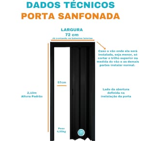 Especificações: É fornecida com trilhos (Laterais e Superior), puxadores, buchas, parafusos, trinco e manual de instruções na embalagem do produto. Altura padrão: 2,10m Largura já com os batentes: 72cm Acompanha Manual de Instalação: Sim Acompanha Puxador: 02 Acompanha Trinco: Sim Ambiente: Interno Composição: PVC Itens Inclusos: 1 Porta, 1 Kit de Instalação e 1 Manual de Instalação. Lado de abertura: Definido na instalação Necessita Montagem: Sim Possui Grade: Não Quantidade de peças por embalagem: 1 Textura da Porta: Lisa Tipo de Parede que pode ser aplicada: Alvenaria, Drywall e Madeira Tipo de Porta: Sanfonada *Não acompanha acabamento/vista/caixilho*