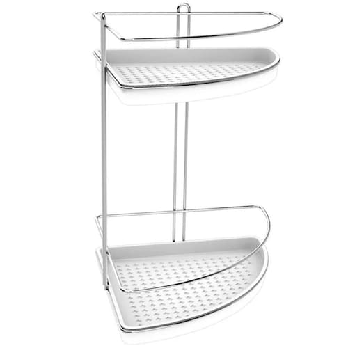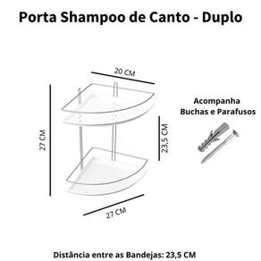 Garantia: 90 dias / Peso: 453g / Cor predominante: branco / Referência: 97679 Dimensões: 27cm (C) x 20cm (L) x 27cm (A); Distância entre as prateleiras: 23,5cm; Itens inclusos: porta shampoo e kit de instalação; Materiais: aço cromado e polipropileno.