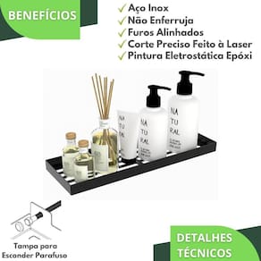 Com um design minimalista, o preferido pelos arquitetos nos últimos tempos, o Porta Shampoo é fabricado utilizando aço inox com acabamento em Pintura Eletrostática Epóxi Preta Fosca com Nanotecnologia proporcionando maior durabilidade, resistência e garantindo que não ocorrerá oxidação nem ferrugem.