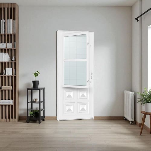 Porta Social de Aço Quadriculado com Vidro – 215x83 cm (Requadro 120) Ideal para quem busca segurança, durabilidade e um visual moderno para seu ambiente. Renove a entrada da sua casa com esta porta social de aço quadriculado.