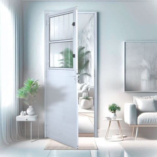A porta social lambril de alumínio, possui uma pequena porta de vidro na parte de cima, que quando aberta permite a passagem de luz e ventilação, esse tipo de porta é indicada para ambientes como cozinha, entrada, área de serviço. O alumínio é um material resistente e leve e não precisa de manutenção constante.