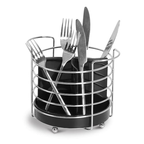 Da marca Niquelart, o Porta Talheres é feito em Aço Cromado e plastico 100% Virgem é fácil de limpar e possui um sistema com furos em sua base que evita o acúmulo de água.
